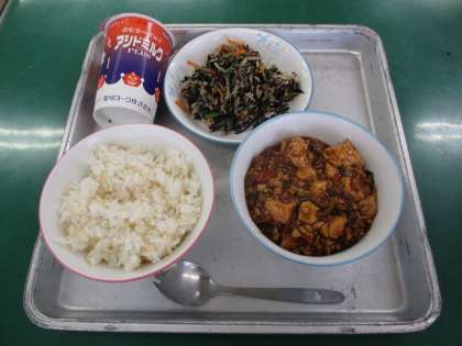 今日の献立は、マーボー豆腐、ささみとひじきのあえもの、発芽玄米ごはん、発酵乳です。