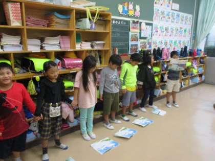 1年生の教室からです。国語の授業でした。動作をつけて物語を読んでいました。