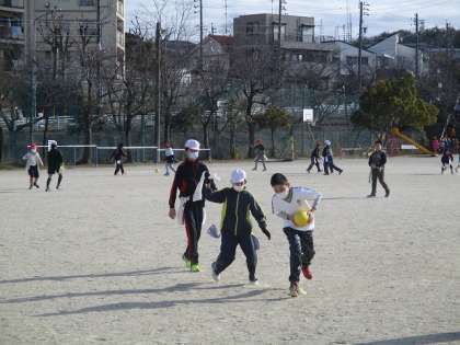運動場からです。5年生が体育の授業をしていました。タグラグビーをしていました。