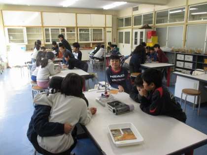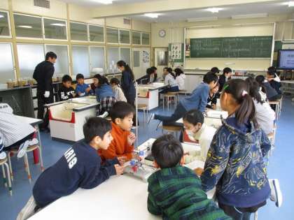 理科室からです。4年生が理科の授業で実験をしていました。金属の温まり方を調べていました。