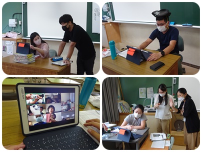 15時から、すべての学級がタブレットをつかって、Zoomの接続テストを実施しました。学童を利用して学校に残っていた児童は、2つの音楽室に別れて参加しました。