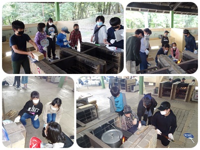 第1炊飯場に移動して、飯盒炊飯です。どの班も、どの係も、みんなよく働きます。今回は、「焼き板」の制作にも取り組みました。