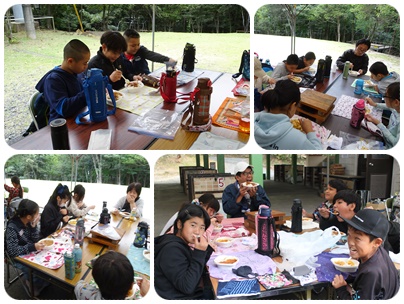 どの班も、おいしいご飯が炊けました。ちょっと早めの昼食は、カレーライスです。みんな笑顔ですが、ここでもちゃんと默食を守っています。