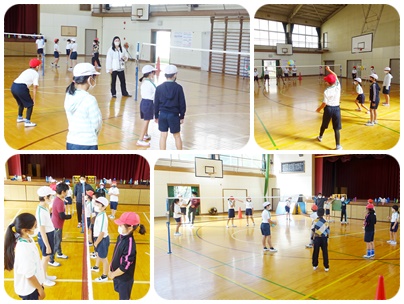 4年生の体育は、バレーボールの試合です。ワンバウンドしてもOKの4年生特別ルールです。