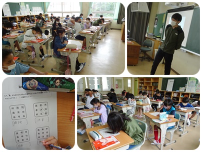 4年生は何やらプリントを使って楽しそうなことをしています。なるほど。わかりました。9つの漢字から、隣り合った2つの漢字を結んで熟語づくりをしているようです。同じ漢字の学習でもこうやってゲーム要素があると楽しみが増しますね!