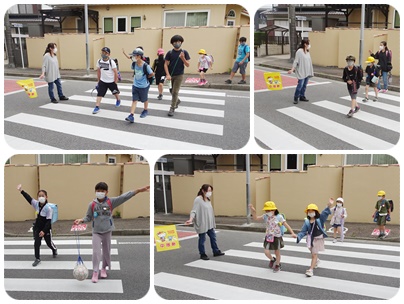 曇り空の朝です。交通当番の保護者の方に見守られ、子どもたちが登校しています。今日の午前中、1年生は交通公園に出かけます。