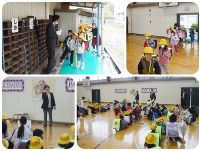 通学団の先生と一緒に、1年生と高学年児童が「お迎え登校」の集合場所の確認をしています。今日は一緒に下校をして、来週の月曜日(10日)の朝から一緒に登校します。