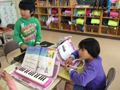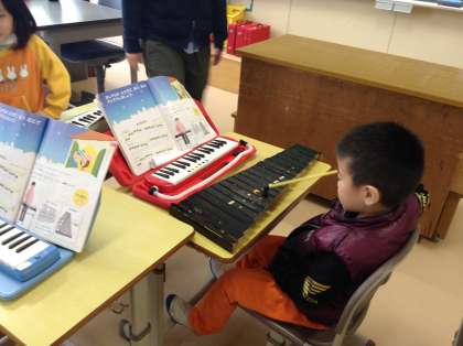 1年生の教室では、発表会に向けて合奏の練習をしていました。木琴や鍵盤ハーモニカを使うようです。色々な楽器を通じて、音を楽しんでくださいね。