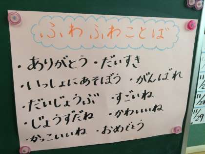 とある教室に貼ってあった掲示物です。こんな言葉がいっぱいの教室にしようという担任の思いが込められています。逆に使ってほしくない言葉を「ちくちく言葉」として表現していました。マザーテレサは「言葉に気をつけなさい、それはいつか運命を変えるから」と言っています。ふわふわ言葉のあふれる、温かい学級にしていきたいものです。