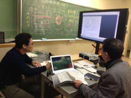 写真の左側は、若い先生がベテランの先生に良い授業法についてアドバイスをもらっているところです。自分の授業を録画して、見てもらってるようです。若い先生に限らず、子どもたちにとってわかりやすい、よりよい授業を目指してがんばっています。