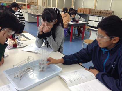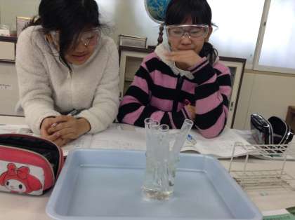 高学年にもなると、理科の実験もかなり本格的なものになってきます。6年生は濃塩酸を使って物を溶かす実験をしていました。目に飛ぶと危険なので、防護用のゴーグルを着用しています。実験が楽しいので、理科は人気の教科の一つです。