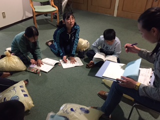 部屋長は、廊下に集合し先生からの指示を聞いています。しおりにメモを取りながら、真剣に話を聞いています。
