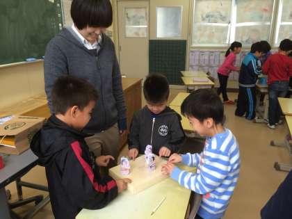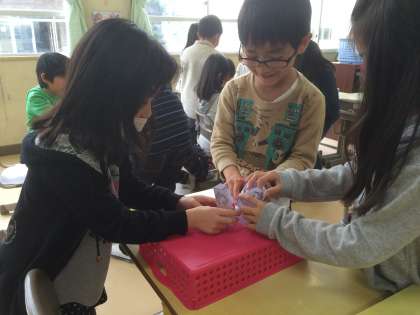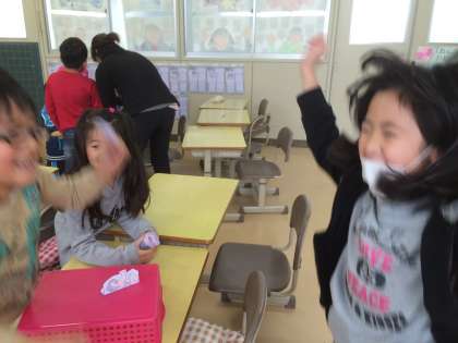 1年生の教室をのぞいてみると、トントン相撲をやっていました。昔から引き継がれる遊びには、いつの時代でも子どもたちを引きつける魅力があります。勝って「ヤッター!」という時の笑顔は、今も昔も変わらないものです。