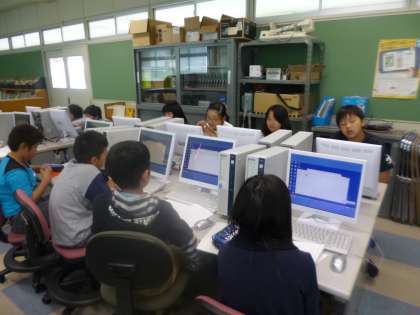 6年生が「愛知のよさを伝えるパンフレットを作ろう」という課題で、パソコンを活用しているところです。
