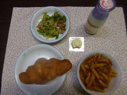 今日の献立は、ミートソースペンネ アスパラサラダ クロワッサン 牛乳 チーズです。チーズはライオンやパンダなどの動物の顔の形になっています。