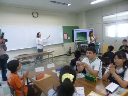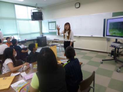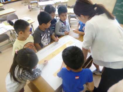 2年生は長さの単位の勉強をしています。6年生はALTの先生と英語の勉強をしています。