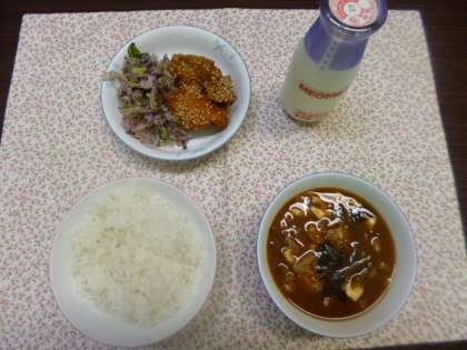 今日の献立は、なめこ汁 鶏肉のてりかけ ゆかりあえ 麦ごはん 牛乳です。残さないデーです。