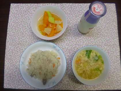 今日の献立は、卵とレタスのスープ メロン入りフルーツポンチ ピラフ 牛乳です