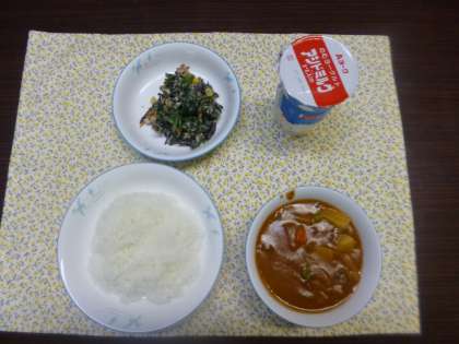 今日の献立は、ハヤシシチュー ひじきサラダ ごはん 発酵乳です