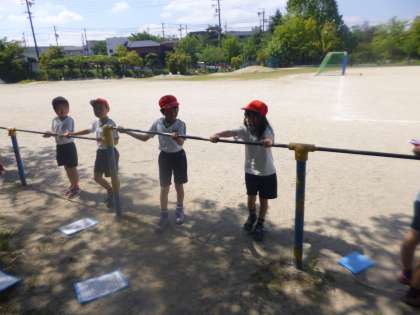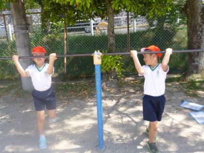 鉄棒の逆上がりの練習です。これからできる技をふやしていきます。