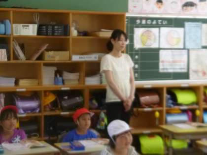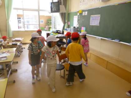 椅子取りゲームを通して「いくつといくつ」の勉強をしています。この時間は、原山保育園の先生に授業を見ていただきました。保育園・幼稚園と小学校とが連携し、子どもたちの成長に連続性をもって関わっていくことが大切だと考えています。
