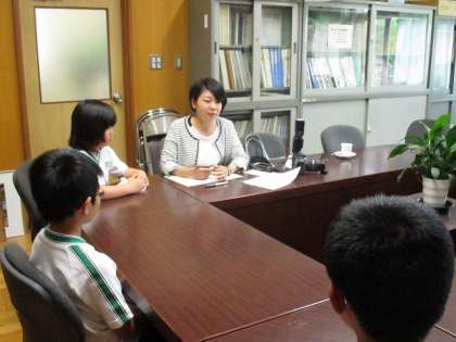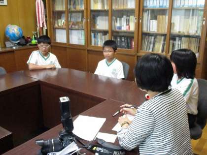 5月24日曇り空。やや涼しさを感じます。今日は、1〜4限まで体力テストがありました。体力テストの合間の長い放課です。校長室に3名の児童が呼ばれました。新聞記者の人に質問をされています。「新聞のどんな記事を読みますか?」「新聞の良いところは何だと思いますか?」などと一人ずつ記者のお姉さんから聞かれていました。みんな緊張しながらも的確に答えていました。毎週日曜日に掲載されている「新聞とわたし」というコーナーに来月掲載される予定です。