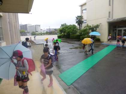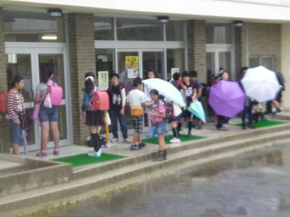 今日は久しぶりの雨です。子どもたちは元気に登校しました。とても早く学校に来る子どもがいますが、玄関の扉は7:55に開けることになっています。登校は8:20までに来る約束です。ご協力お願いします。