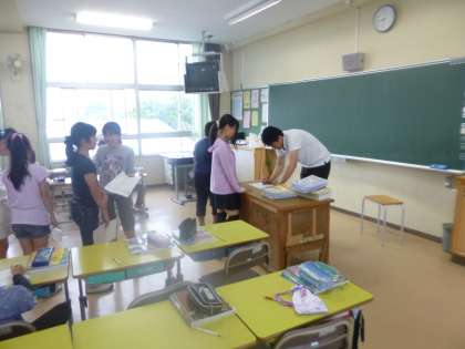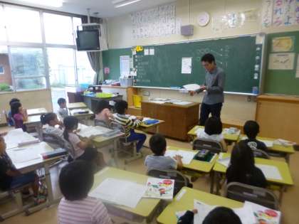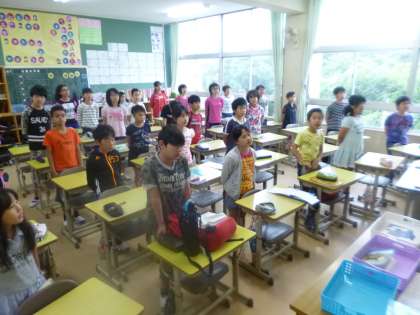 8:30〜8:45は朝の会を行います。朝の会の活動は担任がいろいろと工夫しています。今日の1年生は宿題のやり方の説明を聞いていました。5年生は歌を歌っていました。6年生は漢字の小テストを行っていました。