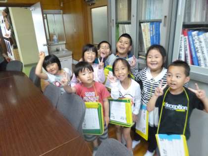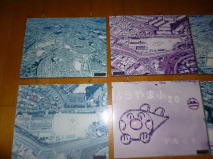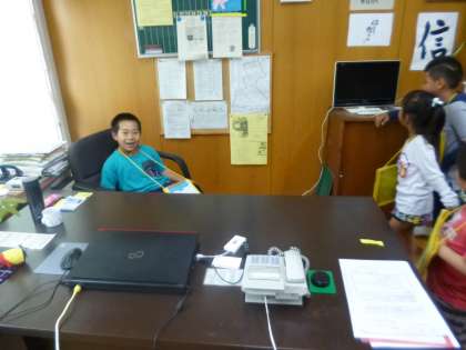 1年生が教室以外のいろいろな教室を見て回ります。校長室では航空写真などに興味を示していました。