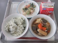 今日の献立は、牛肉とたまねぎの煮物 厚焼きたまご 小松菜のふりかけ ごはん 牛乳です