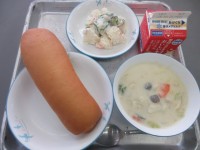今日の献立は、ミートソース、元気サラダ、ソフトめん、牛乳、りんごです。ソフトめんは、ミートソースにからめて食べます。
