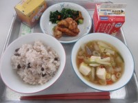 今日の献立は、洋風団子汁、にしんの甘露煮、アーモンドあえ、わかめごはん、牛乳です。