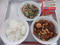 今日の献立は、ポトフ、ハンバーグのトマトソースかけ、ボイルキャベツ、ミルクロールパン、牛乳です。