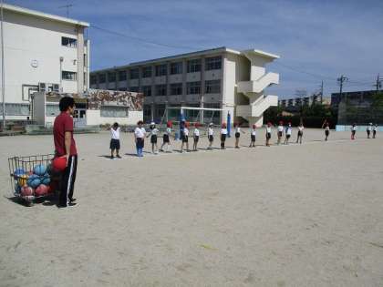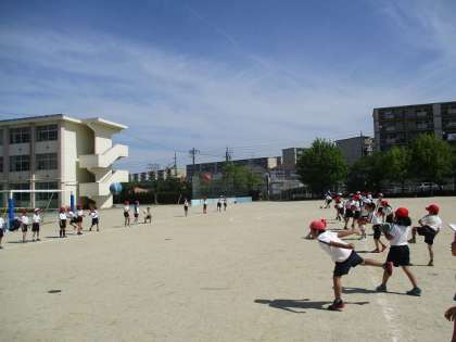 運動場では、3年生が体育の授業をしていました。ボール運動です。遠くに投げる練習をしていました。