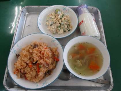 今日の献立は、コンソメスープ、チーズインツナサラダ、チキンライス、牛乳です。