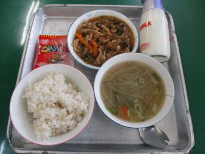 今日の献立は、ワンタンスープ、野菜豚丼、麦ごはん、牛乳、アーモンド小魚です。