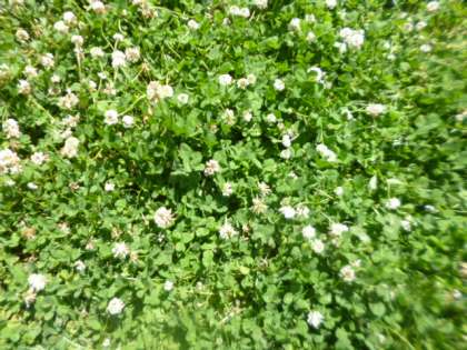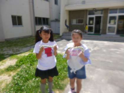 中庭にさいているシロツメグサ(クローバー)を使って、花の冠を作っていました。とても上手にできていました。