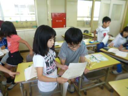 自分の考えを友だちと発表し合っています。協働的な学習の方法のひとつです。