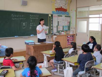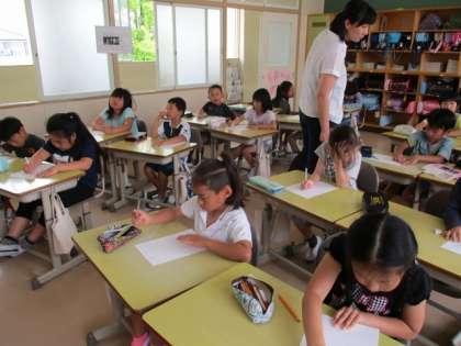 2年生の教室です。先生の説明をしっかり聞いています。作品募集のアイデアスケッチをしていました。