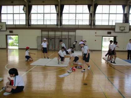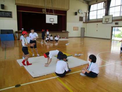 体育館からです。6年生が体育の授業をしていました。マット運動です。グループごとに課題を決めて練習をしていました。