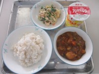 今日の献立は、肉じゃが、アーモンドあえ、わかめごはん、牛乳です。