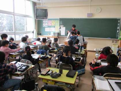 4年生の教室からです。書写の授業でした。毛筆で「早春」と書いていました。