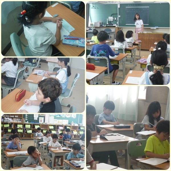 3時間目の様子を見てみると、1~2年生は、体育館でスポフェスの競遊(ダンス)の練習でした。太陽学級は個別学習ですが、2けた×2けたの筆算や、4けた÷1けたの筆算などを真剣に解答していました。3年2組は算数「重さ」の単元で、ばねばかりを学んでいました。3年1組は道徳の「親切・おもいやり」について『教えてあげる?持ってあげる?』の教材について話し合っていましたが、「これは優しくないよねぇ!」と真剣に話し合いが盛り上がっていました。5年生は理科「台風と天気の変化」の単元で、台風について調べていました。4年1組は国語「秋の楽しみ」で、秋ならではのものを想像したり詳しく説明したりしていました。4年2組は図工「読書感想画」が最後の段階でした。6年生は算数「データの整理と活用」で、平均や中央値について学んでいました。日本語教室は、国語の物語文「ちいちゃんのかげおくり」の読み取りを頑張っていました。