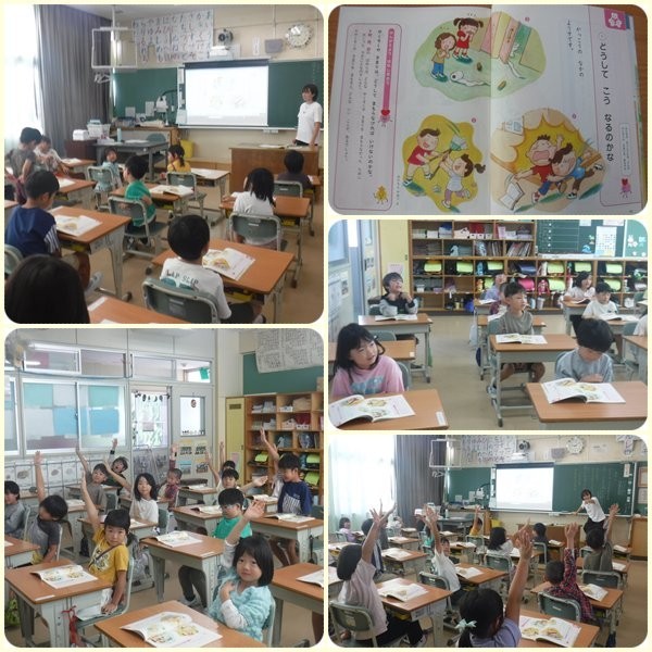 4時間目の様子を見てみると、1年生は体育でした。スポフェスに向けた練習でしょうか?太陽学級は道徳「ありがとうがいっぱい」の教材について考えていました。5年生は算数「分数」で、「分数とは何か」を確認し合っていました。4年生はどちらの教室も社会で地域学習「清須市・名古屋市」に取り組んでいました。日本語教室・3年生は「ちいちゃんのかげおくり」です。しっかり読み取りを頑張っていました。2年生は教室を見たとき、ちょうど、算数の(下)の教科書をみんなで確認している最中でした。新しい教科書は、わくわくしますね。