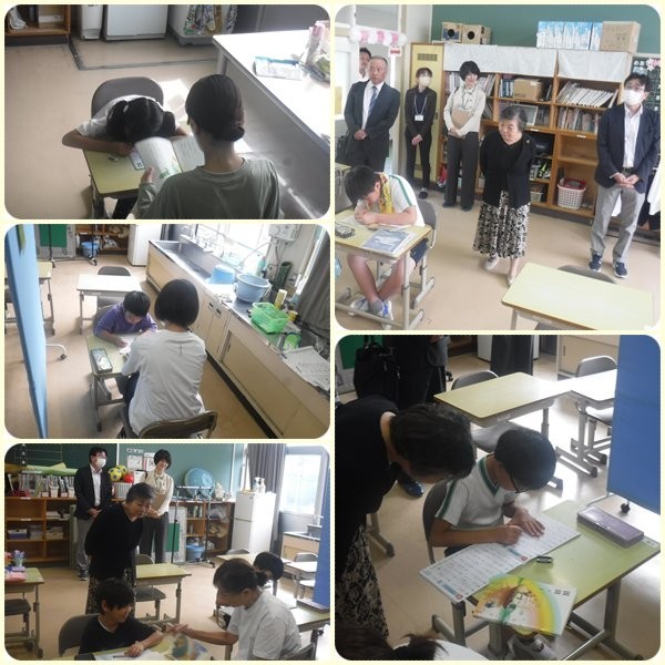 2時間目の様子を見てみると、3年生は理科で、中庭に出て虫を探していました。もう1クラスは、タブレットを使い、社会科「店ではたらく人々」のまとめをしていました。6年生は家庭科で、ミシンの下糸を通す練習でしたが、苦戦しながらも、「通った!!」と頑張っていました。1年生は算数「3つのかずのけいさん」と、国語の漢字練習で、とても丁寧にノートに書いている授業でした。2年生は図工で「読書感想画」の続きの色塗りです。日本語教室は、国語「ちいちゃんのかげおくり」の中にある難しい言葉を国語辞典で調べていました。4年生は算数「式と計算の順序」のまとめです。太陽学級は、個別学習を進めていましたが、6年生は先日行った修学旅行で、ガスパビリオンの方にとてもお世話になったので(本来は、入場の1時間前に手続きが必要ですが、渋滞にはまり、かなり遅く到着してしまいました。それでも、特別に急遽、パビリオンに入る手続きをしてもらったりしました)、そのお礼の手紙を書いていました。