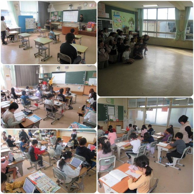 1時間目の様子を見てみると、太陽学級では、話す順に沿ってスピーチの学習をしていました。聞き手もしっかり聞いて質問をしたり、さらに質問に答えたりと、コミュニケーション力の向上にもつながっています。5年生は理科「流れる水のはたらき」で、川の上流・中流・下流の特徴について、タブレットのオクリンクプラスを使いながら、グループごとに特徴をまとめていました。6年生は算数「データの整理と活用」で、「順序良く調べ、ちょうどよい場合を調べる」という学習中でした。日本語教室は、日本語学習のウォーミングアップで日にちの読み方を学習していました。2年生は漢字練習しているクラスと、物語文「おちば」を読んで感想を書いているクラスがありました。1年生は足し算で、さくらんぼ計算(10の合成・分解)を学んでいるクラスと、読書感想画の作品カードづくりと鑑賞で友達の作品の良さを見つける学習のクラスとありました。3・4年生はスポフェスのダンス練習でした。