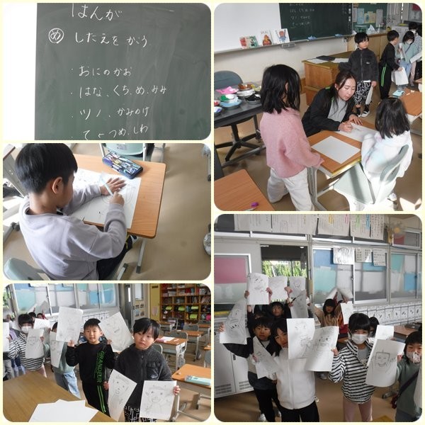 2組は図画工作の授業で、版画の下絵で鬼の絵を描いていました。