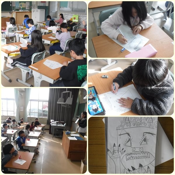 2組は図画工作の授業で、版画の下絵で鬼の絵を描いていました。