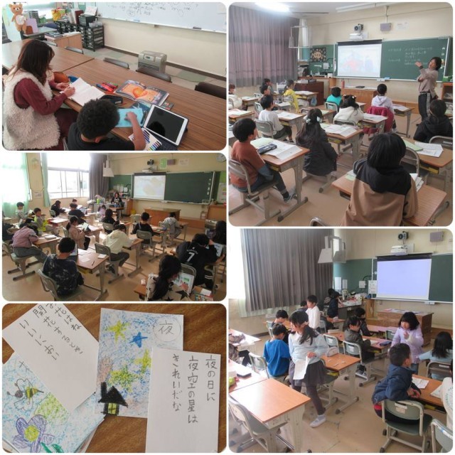 4時間目の様子を見てみると、太陽学級では図工で「紙のコマ」を作っていました。作り方の手順を一つずつ提示することで、分かりやすくなり、自信をもって作成していました。5年生は算数「割合」の復習を、6年生は国語「詩の朗読」で、どのような読み方をすると詩の内容を適切に表現できるかを考え、練習していました。日本語学級では、日本の正月の文化を体験したり、学級で学んでいる詩をもっと楽しく学んだりしていました。2年1組は図工「ふしぎな たまご」で、カラフルなたまごを想像しながら描いていました。2年1組は漢字練習を、3年1組は養護教諭による保健指導を、3年2組は国語「詩のくふうをたのしもう」で、みんなで群読を楽しんでいました。1年1組は生活リズムの振り返りを、1年2組は生活科で家族の振り返りをしていました。4年生はなわとびやサッカーをしていました。