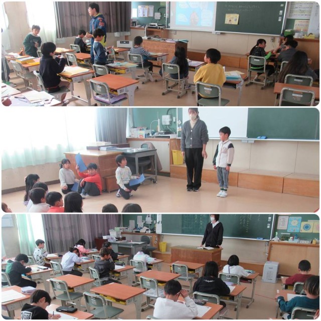 2組は国語の授業で、詩の発表の練習を行っていました。太鼓の音がいいですね。